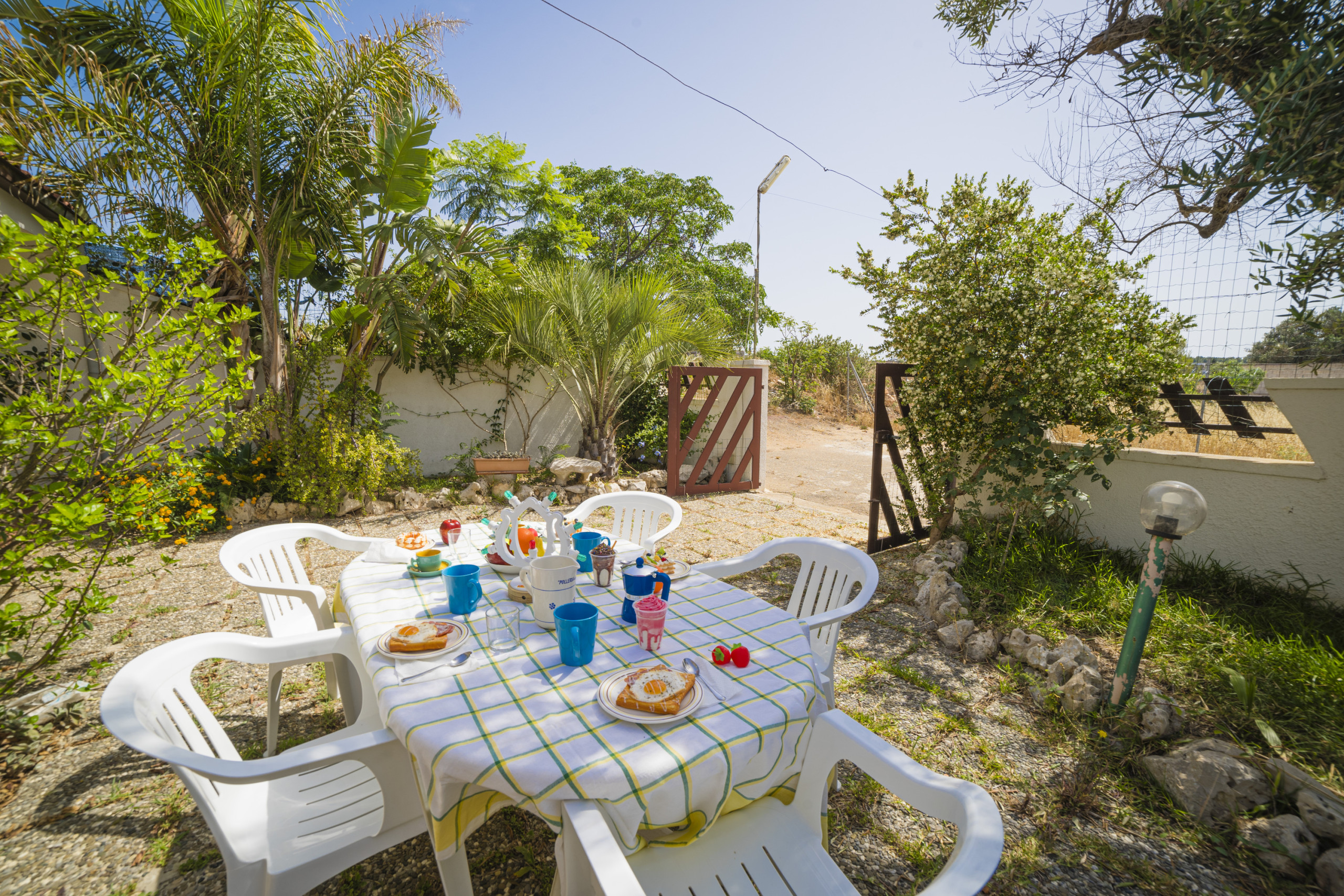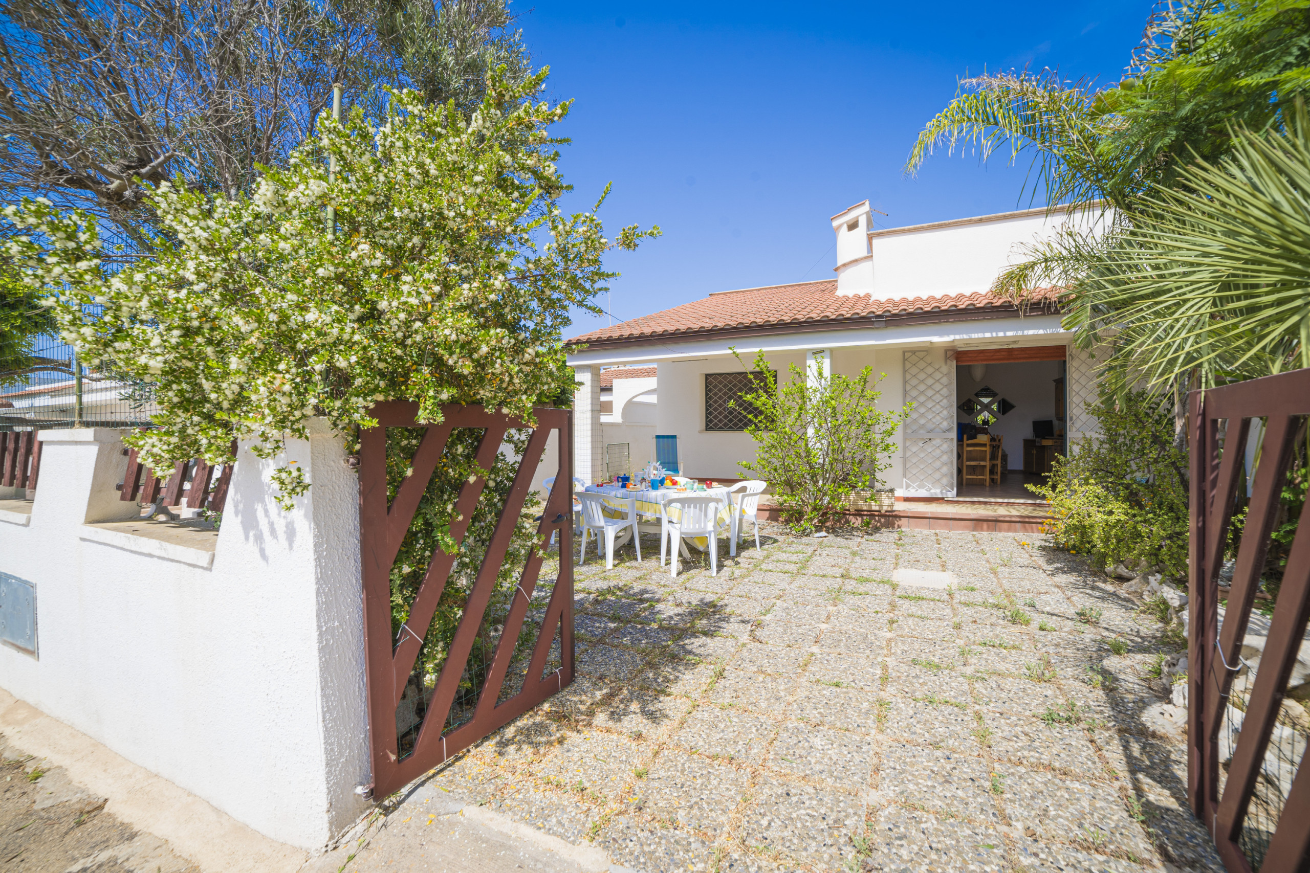 Die schattige Veranda heißt die Gäste willkommen, während das helle und luftige Wohnzimmer im Inneren der Villa zum Verweilen und geselligen Beisammensein einlädt. Die elegante Küche mit ihren attraktiven Fliesen bietet Blick auf den hinteren Innenhof und schafft so ein perfektes Gleichgewicht zwischen Funktionalität und Stil. Der Schlafbereich umfasst zwei geräumige und helle Schlafzimmer, die Komfort und Entspannung bieten. Das Badezimmer ist mit Dusche, Waschbecken, Bidet und WC ausgestattet. Eine Außendusche mit Waschbecken rundet das Angebot ab – besonders praktisch nach einem Tag am nahegelegenen Strand.