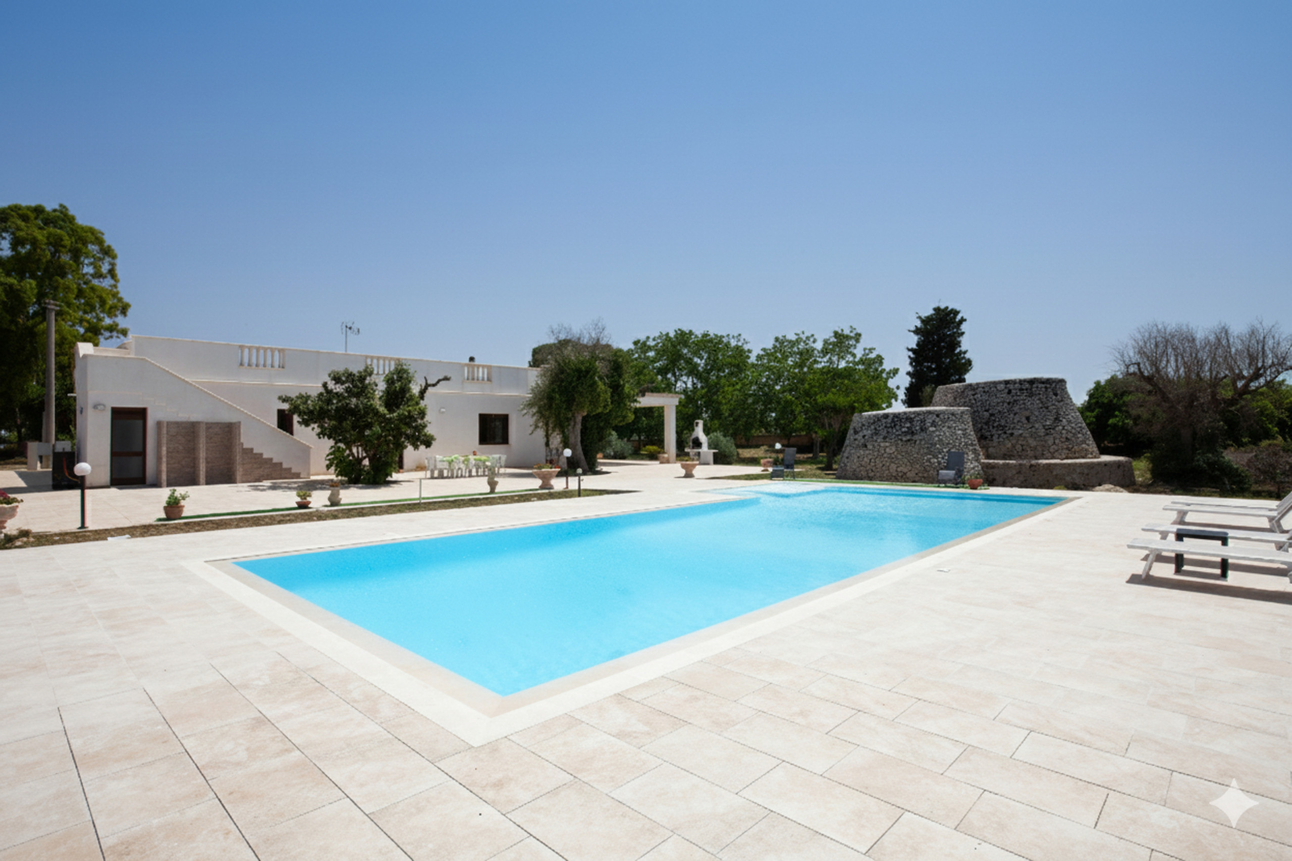 It was not easy to find the right home, many days walking through the countryside, looking for a unique, comfortable, but private place, in which to build a dream villa. We liked renovating more: not to consume more land, but to revive the past, elevated by modern comforts. We therefore took a rural home, inhabited by farmers dedicated to cultivating the land. The land of almost 20,000 square meters was fantastic, regular, with many fruit trees and surrounded by two roads, one for the sea and the town, the other internal, for walks through the fields. Just on the outskirts, with the town easily reachable on foot. We spent a year in the design, thinking about what was comfortable and beautiful, orienting the rooms based on the movements of the sun and we finished it at the end of 2019. The corridors then, some underestimate them, but in this villa they are an integral part of daily life, not places of passage. In the house we have: 3 large double bedrooms. A bathroom with facilities has an extra large bathtub, the second bathroom has a very comfortable shower box, with a multifunctional column. The third bathroom is outside. There is also a laundry room. Both the kitchen and the living room have large windows overlooking the rear veranda, where you can admire enchanting sunsets. The kitchen is habitable, measuring 30m2, with many accessories. The living room, very large, measures 45m2, a fine and bright environment, with 3 openings to the outside that look like natural paintings. There is a large study of 20m2. Externally the estate gives the best of itself. A bricked buffer area, of about 600m2, surrounds the building on all sides, equipped with a stone barbecue and two wonderful usable pajare (trulli Salentini). From the living room and the kitchen, you will see a splendid body of water, which rises in the immediate vicinity of the house, to be fully experienced. The infinity pool has just been built according to very high standards. The water is sterilized through salt electrolysis, not chlorine, so it is not irritating, even after prolonged use. The outside of the pool is insulated, so it could also be heated in the future. It measures 16 meters in length and 8 or 6 in width. In the widest area there is a children's beach and access stairs. Along the entire length of one side we have a hydromassage seat with 4 positions. This splendid pool, completed in 2023, has 3 areas with different depths: a relaxation area of 1.2 meters, an intermediate area of 1.5 meters, a deep area of 2 meters in height. Around it we find a large brick area equipped with sun loungers. Nearby, adjacent to the building, but with external access, there is a third bathroom equipped with a toilet and sink (perfect for swimming pool use) and 2 shower cubicles. Next to the showers there is a basement with a technical room. The villa was designed to be extremely energy efficient. The walls are fully insulated with panels and also under the attic flooring, to avoid thermal bridges. It also has a 6KW photovoltaic system, solar (hot water panel), heat pump, hybrid boiler and also 12.5KW storage batteries. A convenient feature for owners of electric cars is the home charging station (well box). The villa has two entrances. The large surrounding countryside, almost two hectares, completely fenced is a marvel, having many large fruit trees. In fact, we see: 8 fig trees with different varieties, 3 large walnut trees, 1 centuries-old almond tree, 3 mulberries, 1 persimmon, 2 plums, 2 medlars, 1 peach tree, 1 plum tree and two white table grape plants. There are also various ornamental plants. The elegant villa is located just on the outskirts of the characteristic village of Carpignano Salentino, which can be reached quickly on foot.